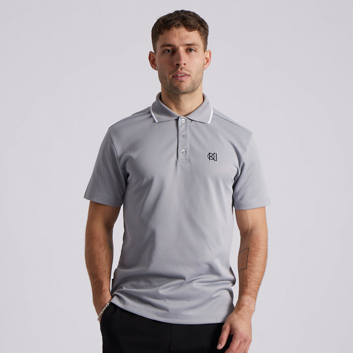 grey golf polo in studio