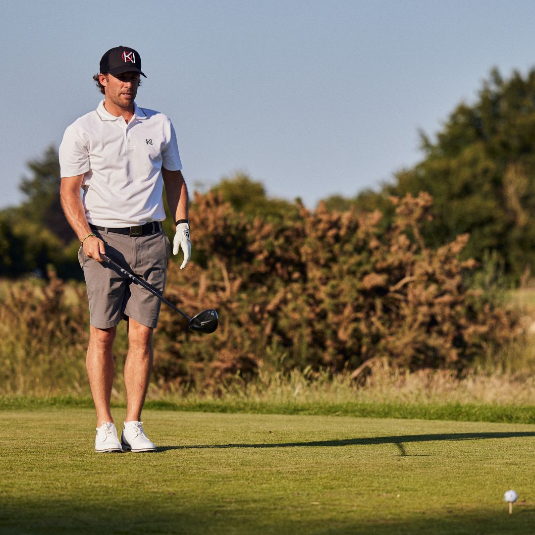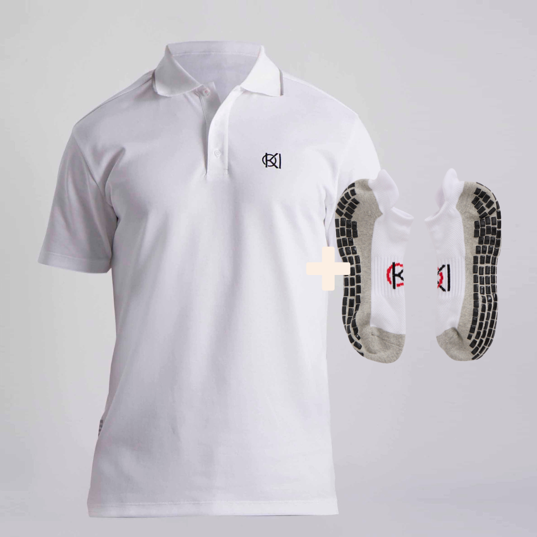 Bundle & save with our white performance polo and anti slip socks. Experience ultimate comfort and style with our eco-friendly golf polo, made from 56% Recycled Polyester and 44% Organic Cotton. Proudly crafted in Portugal, this polo is perfect for mild to warm weather, featuring a smooth interior and breathable fabric. The contrast ribbed trim on the collar adds a touch of sophistication, while the 195gsm weight ensures a luxurious yet lightweight feel. Designed with extra length for easy tucking, it offers a flattering, functional, and stylish, slim fit.